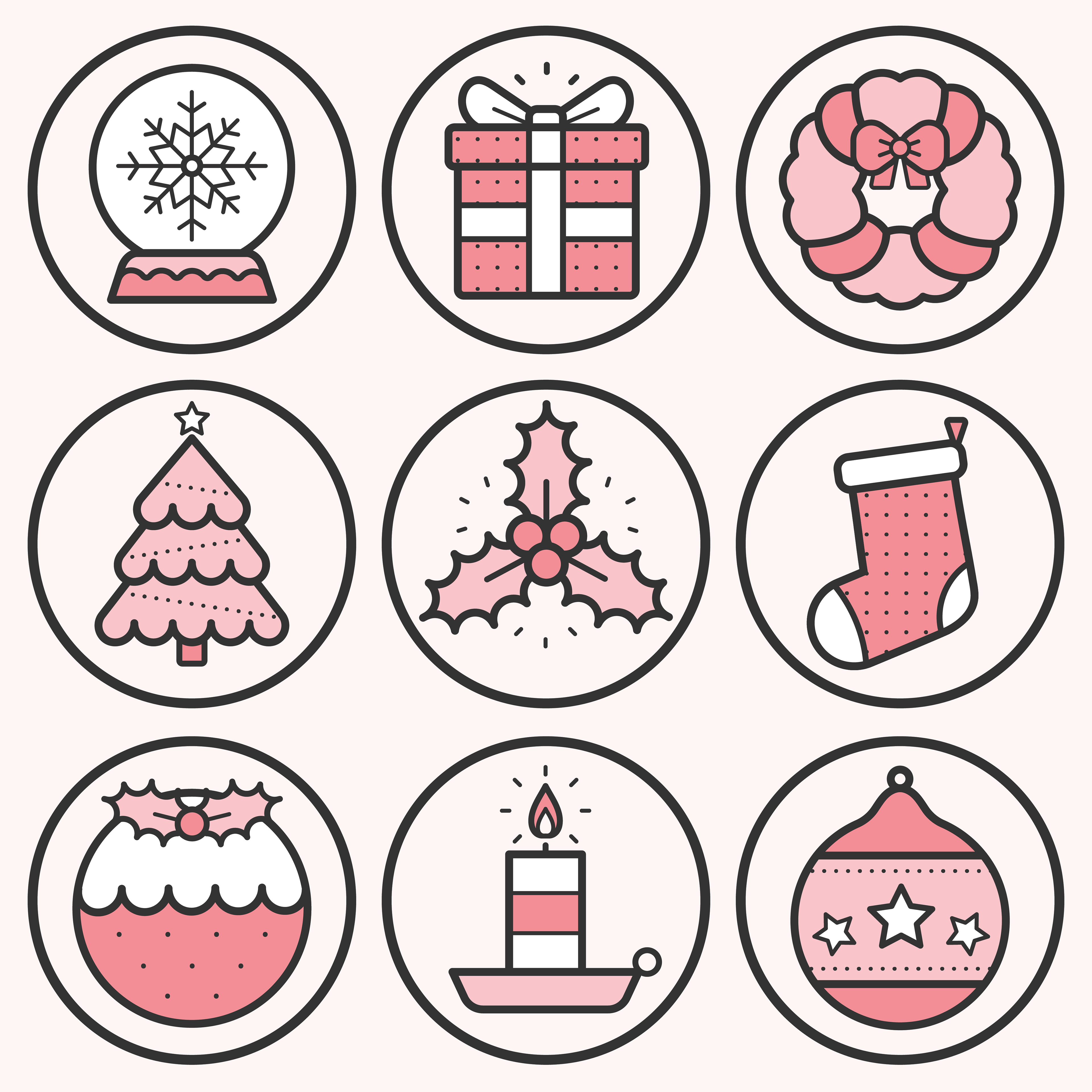 A set of nine Christmas themed icons, shown in a variety of colour schemes.
