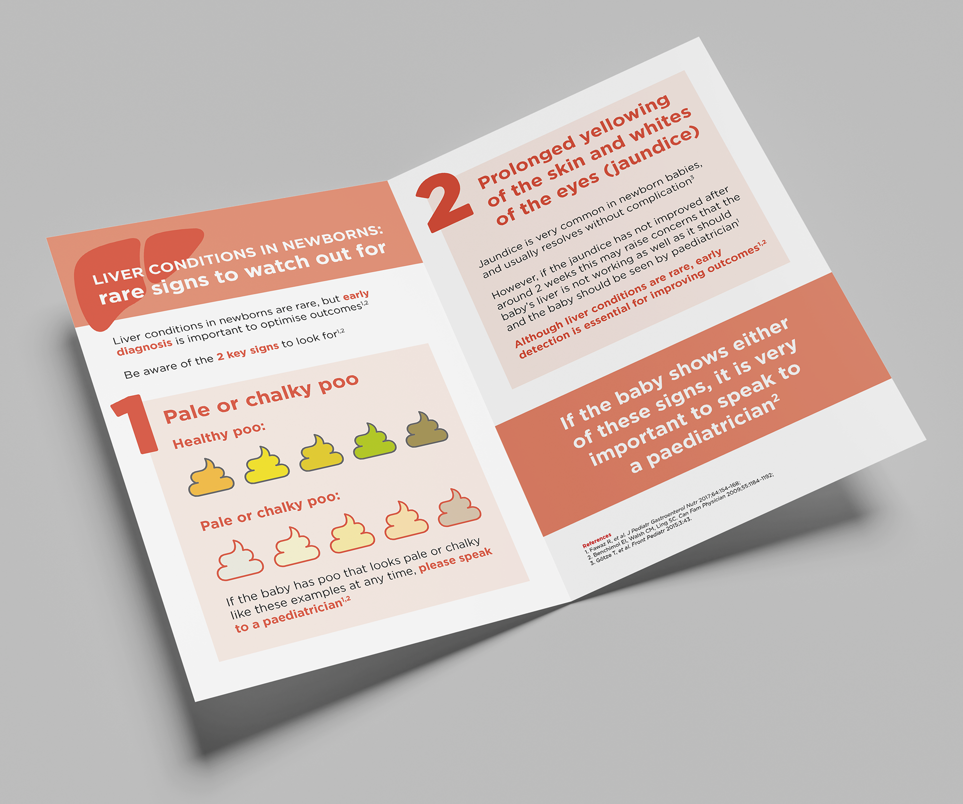 A three-part booklet series designed to raise awareness of rare liver conditions in newborns, tailored for nurses and midwives, parents, and paediatricians. The project focused on translating complex medical information into clear, accessible guidance, using warm visuals and simple iconography.
